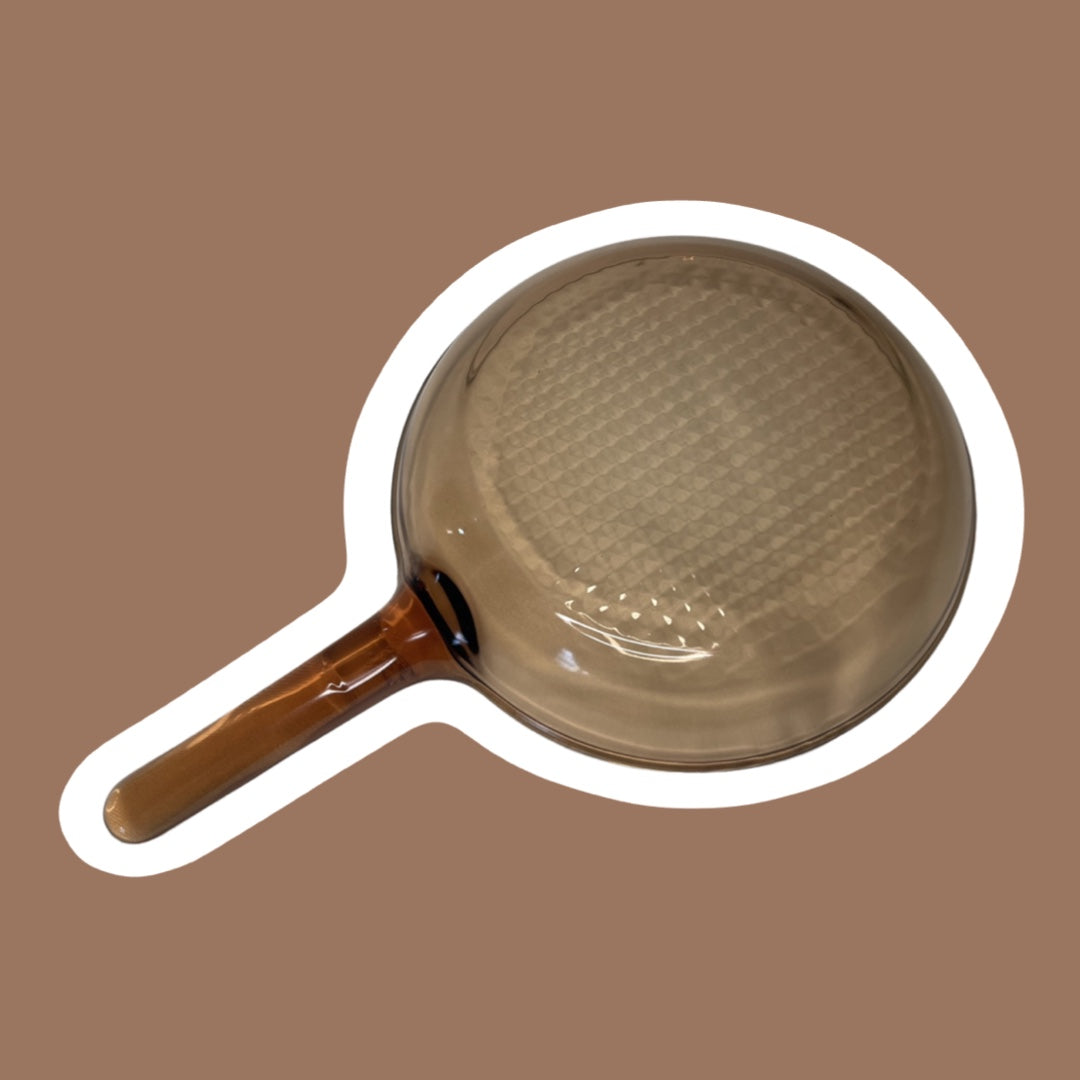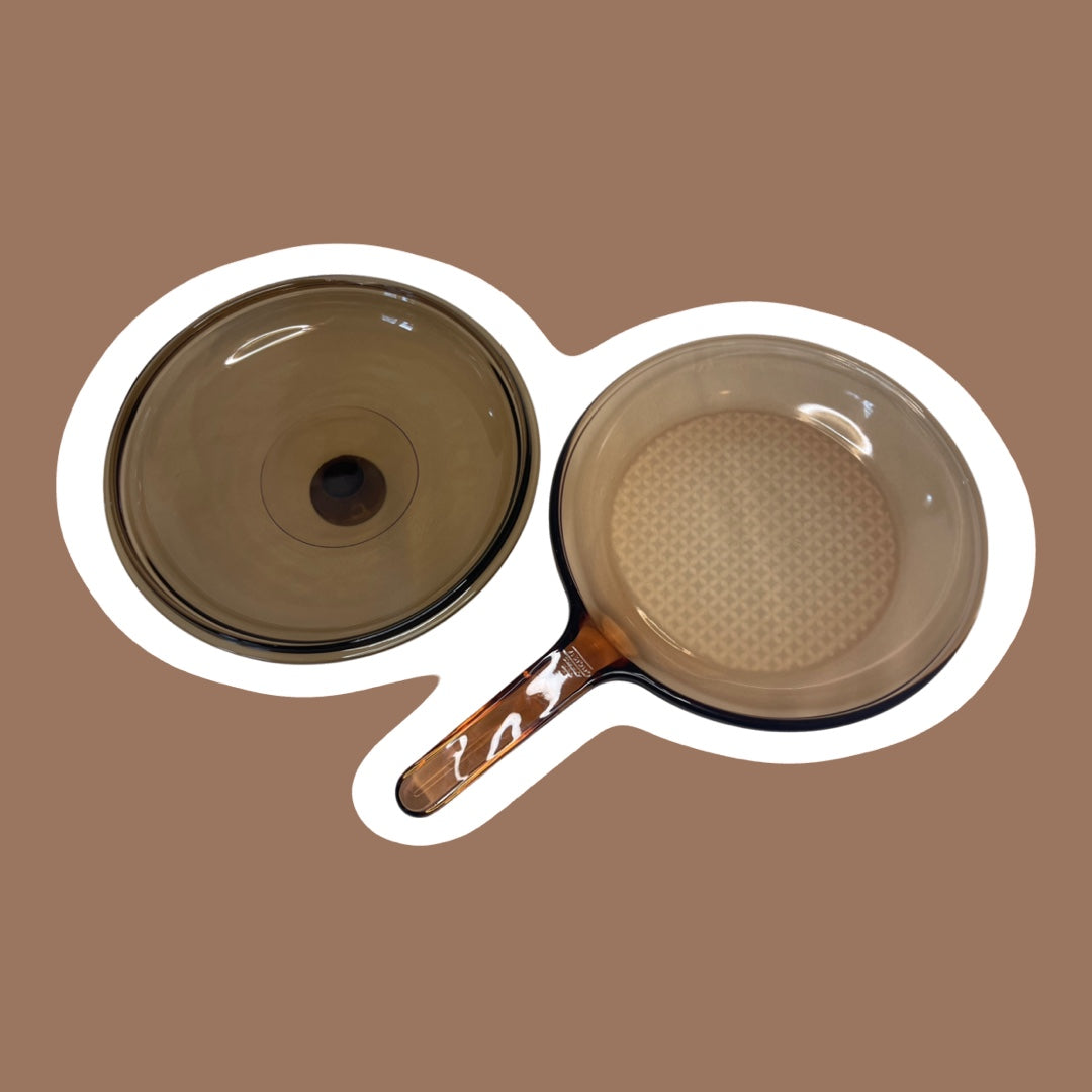 Esta es una sartén para freír de vidrio ámbar Pyrex/Corning "Vision Ware" de 10" con base de rejilla y tapa incluida. ¡Estas piezas son divertidas para cocinar y son una excelente incorporación a una cocina vintage, bohemia o ecléctica!