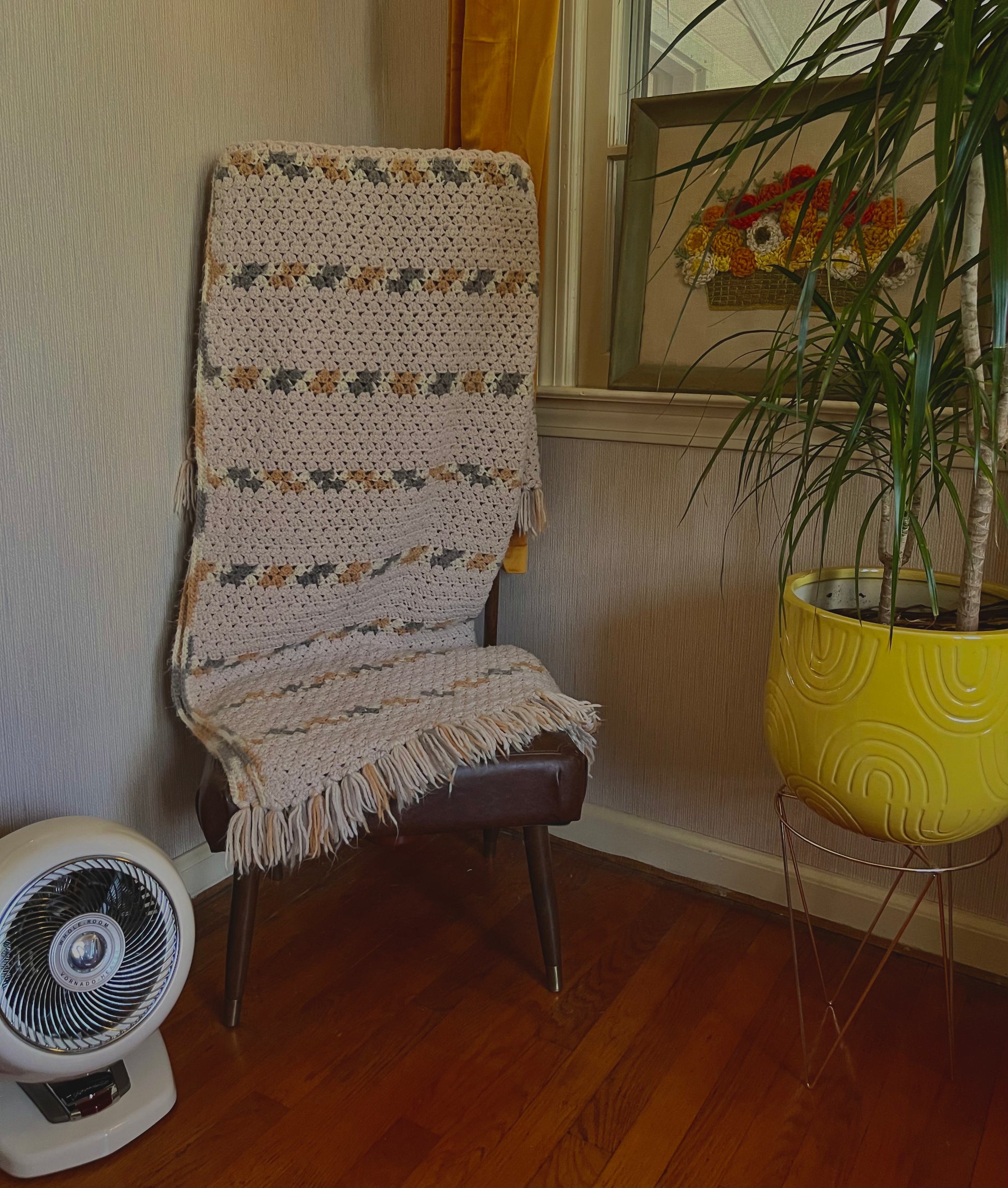 Manta tejida a crochet o de estilo bohemio vintage súper acogedora en colores neutros, como tostado, gris y marrón. Adorables borlas bordean los bordes cortos de esta manta.