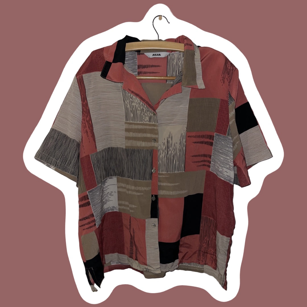 Adorable camisa con cuello y botones, con estampado abstracto de cuadros en rosa, negro y gris topo/canela. Esta camisa tiene hombreras incorporadas que se pueden cortar fácilmente si se desea. Etiquetada como talla 18W.