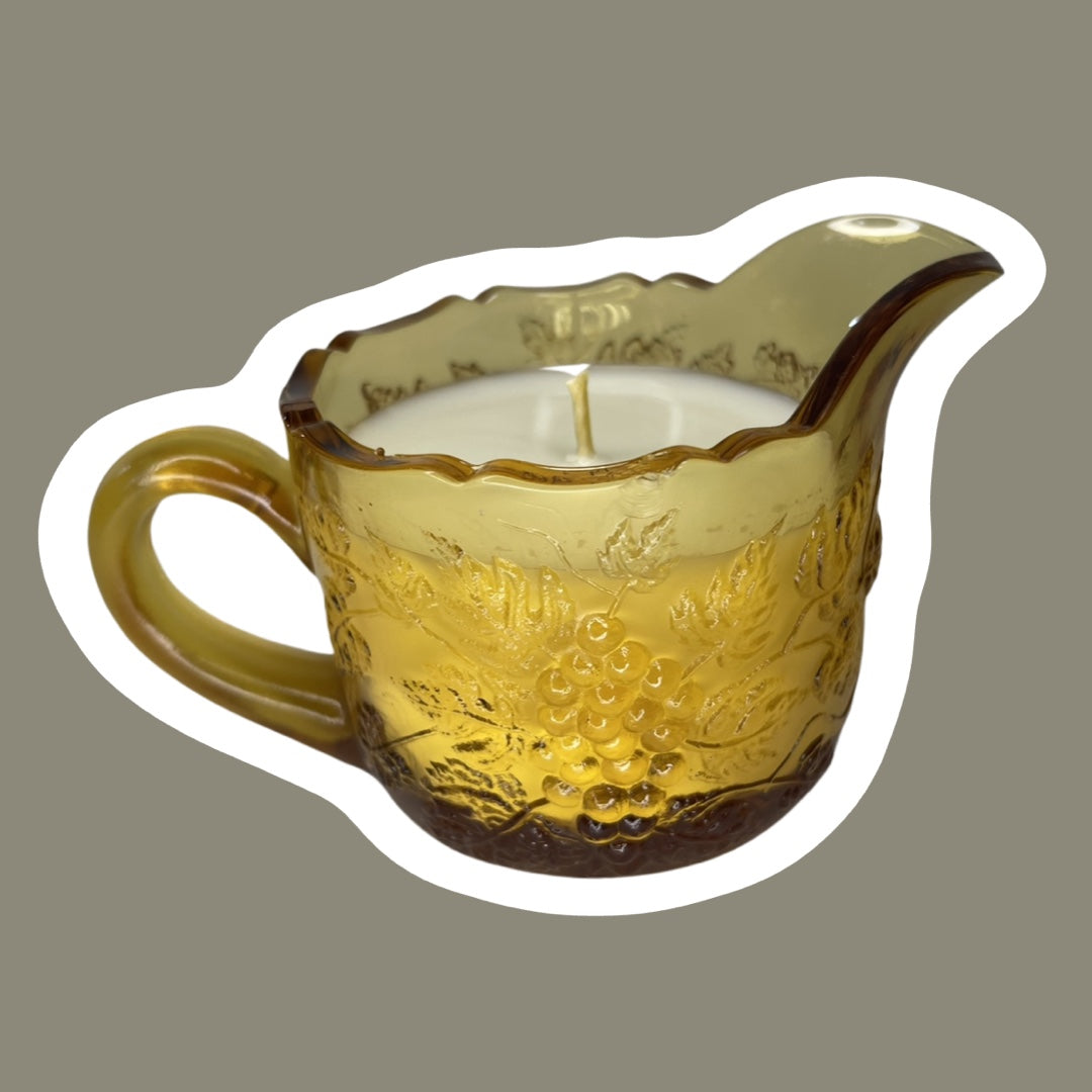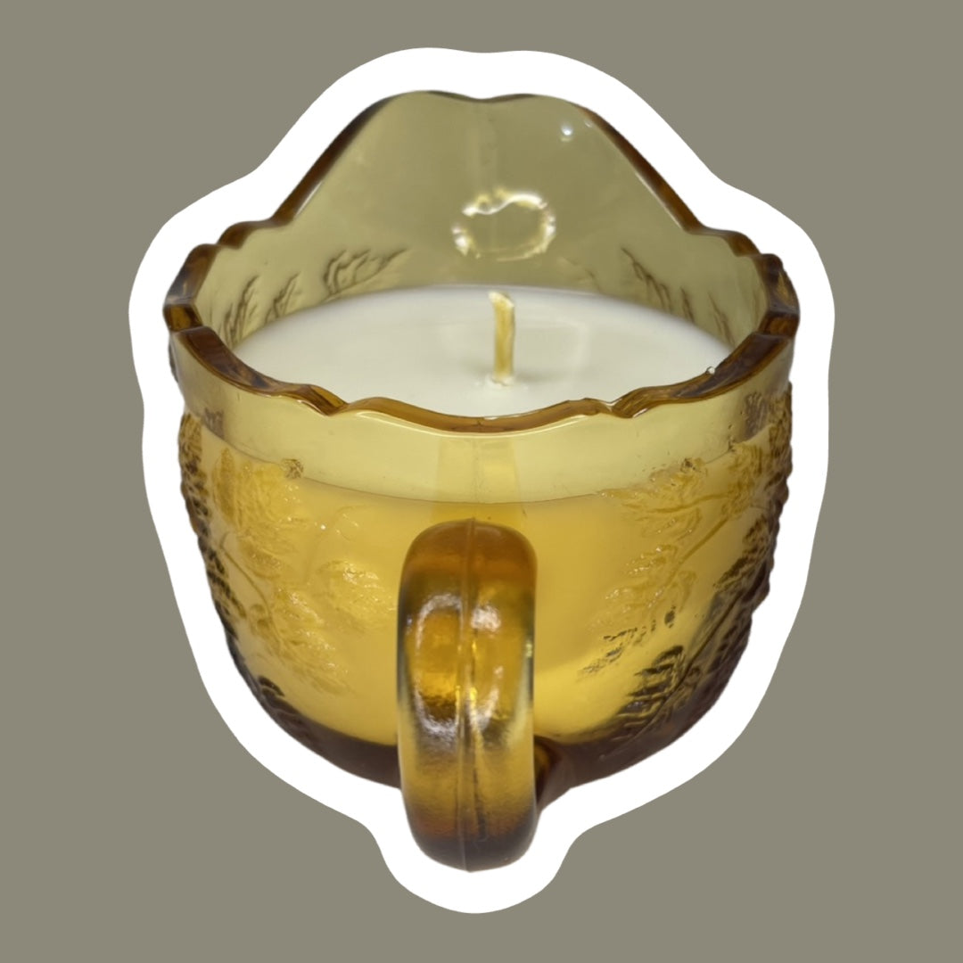 ¡Bonito vaso de crema en relieve de color ámbar convertido en vela! Esta vela está hecha de cera de soja junto con aceites esenciales de vainilla, naranja dulce y limón para crear un aroma cítrico ligero y cremoso que seguro agradará a cualquiera. La mecha está hecha de cáñamo y cera de abejas y arde de forma más limpia que las velas de cera de parafina tradicionales.