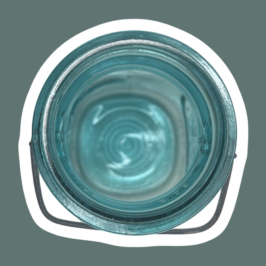 Clásico tarro de cristal azul de 32 oz con forma de bola que se fabricó en la década de 1970 para la celebración del bicentenario. Lamentablemente, este tarro no incluye tapa, pero se puede usar como decoración, para guardar cosas o incluso como florero.