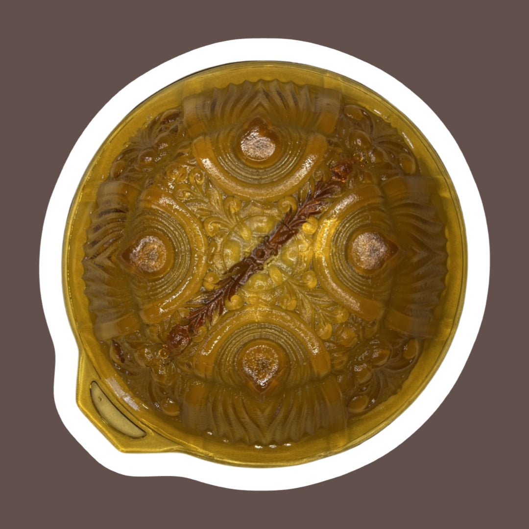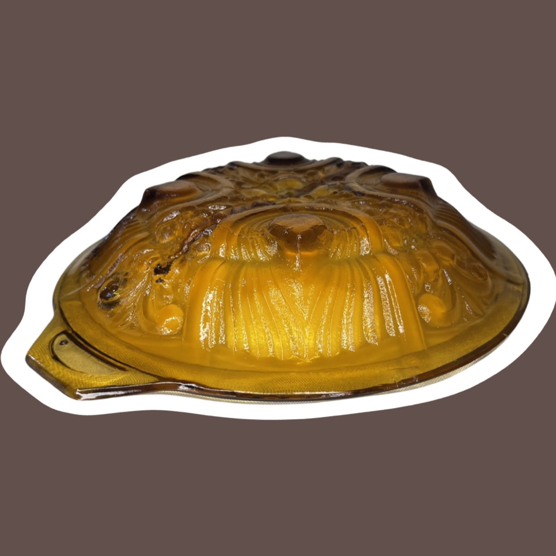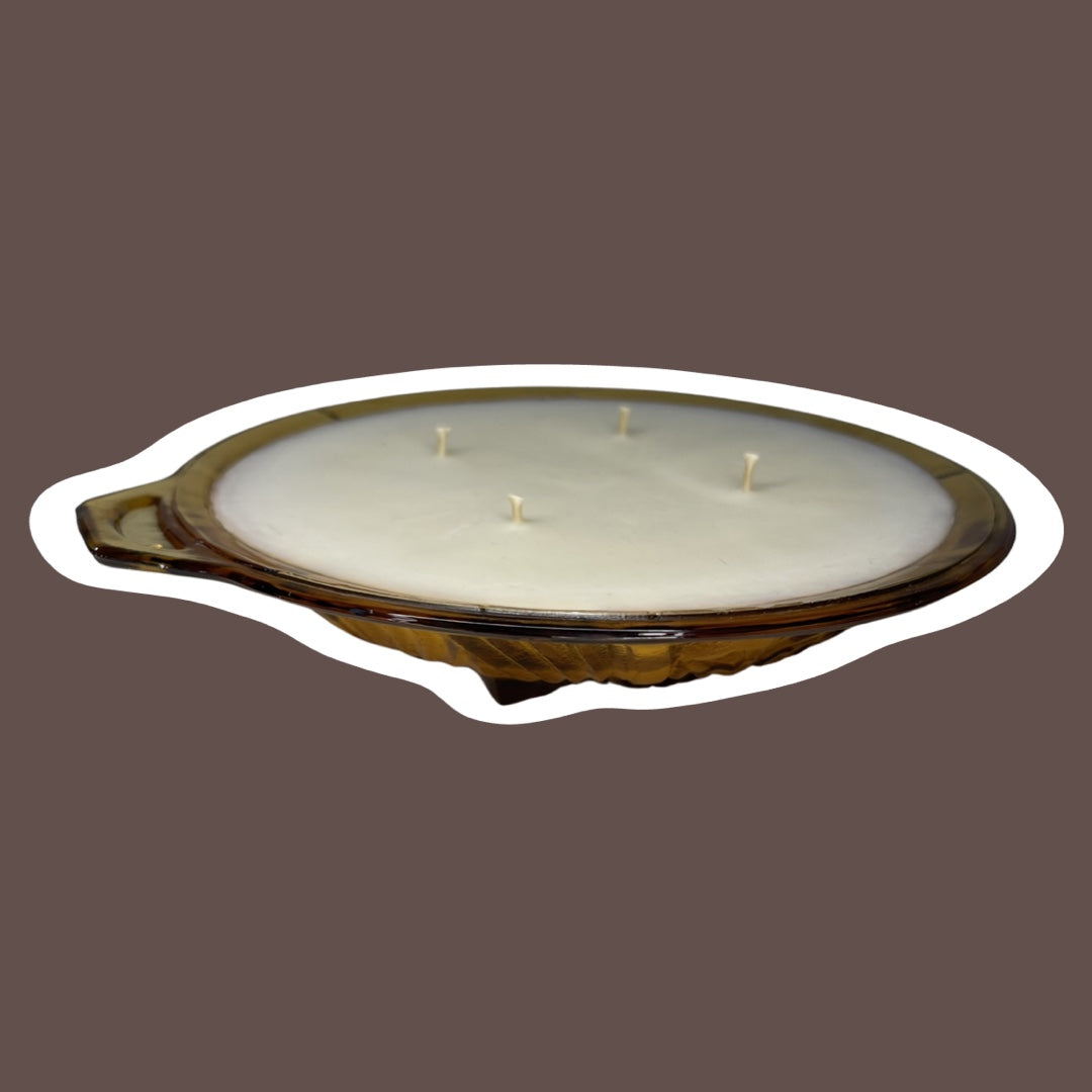 Bandeja para dulces o baratijas con base de vidrio de Indiana adornado en ámbar, vela de cera de soja de cuatro mechas