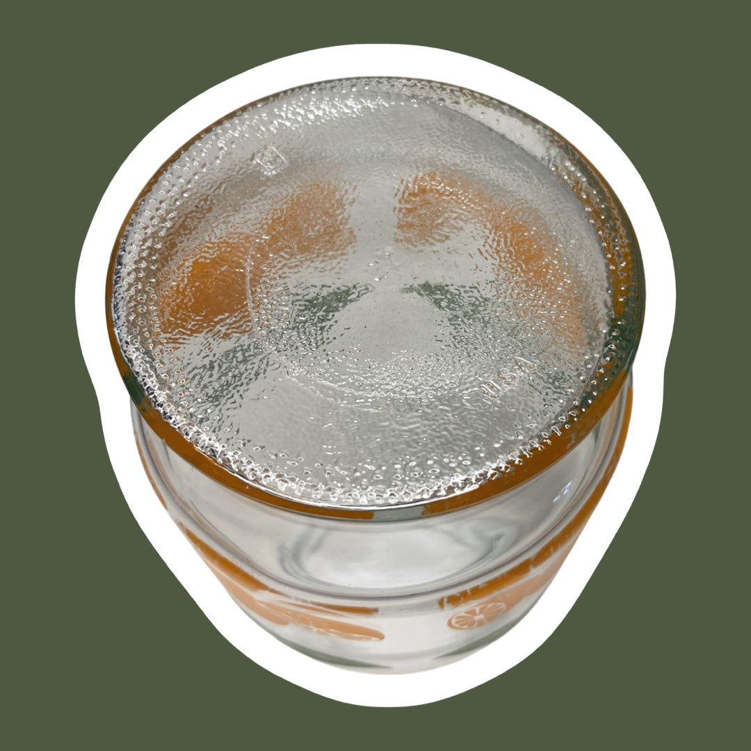 Esta es una jarra de jugo con diseño de naranja de Anchor Hocking de la década de 1970.