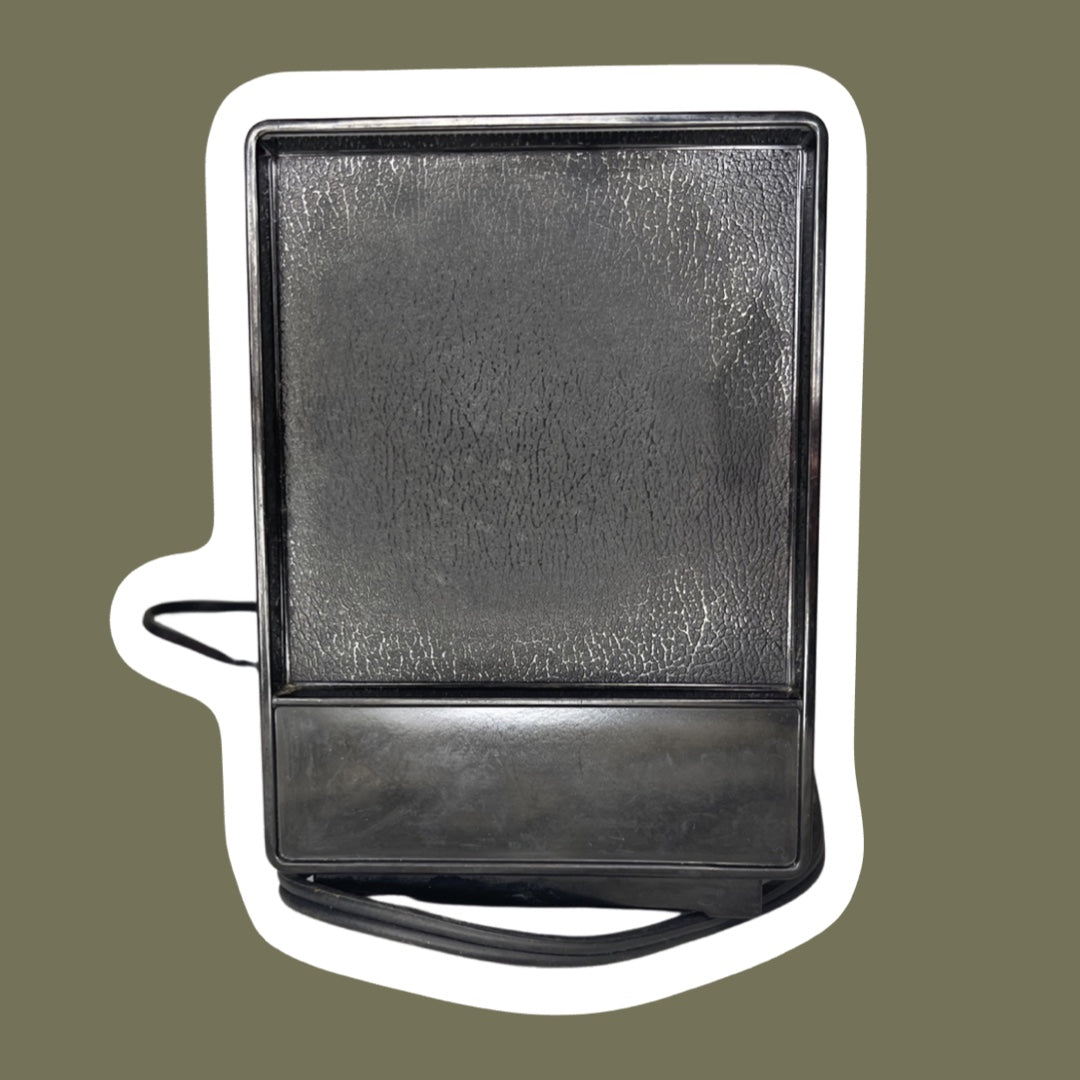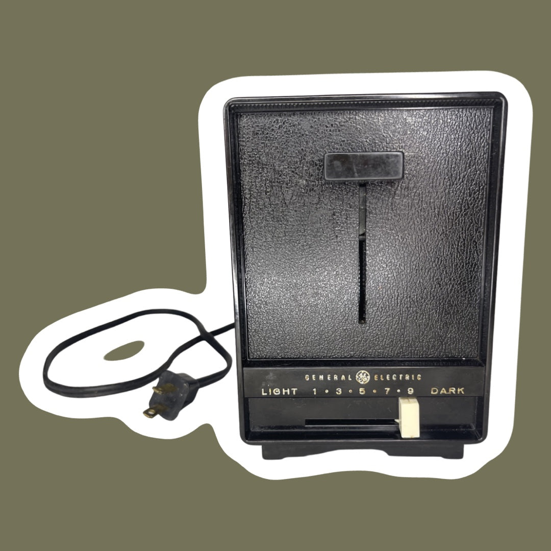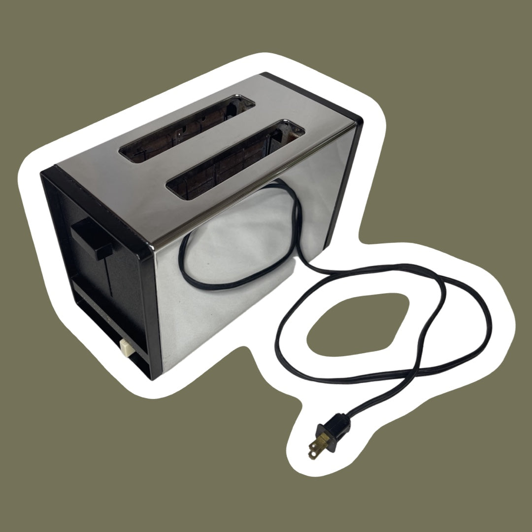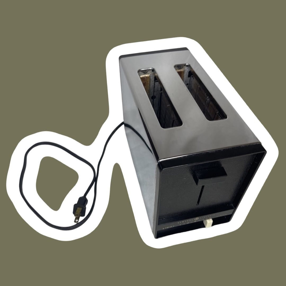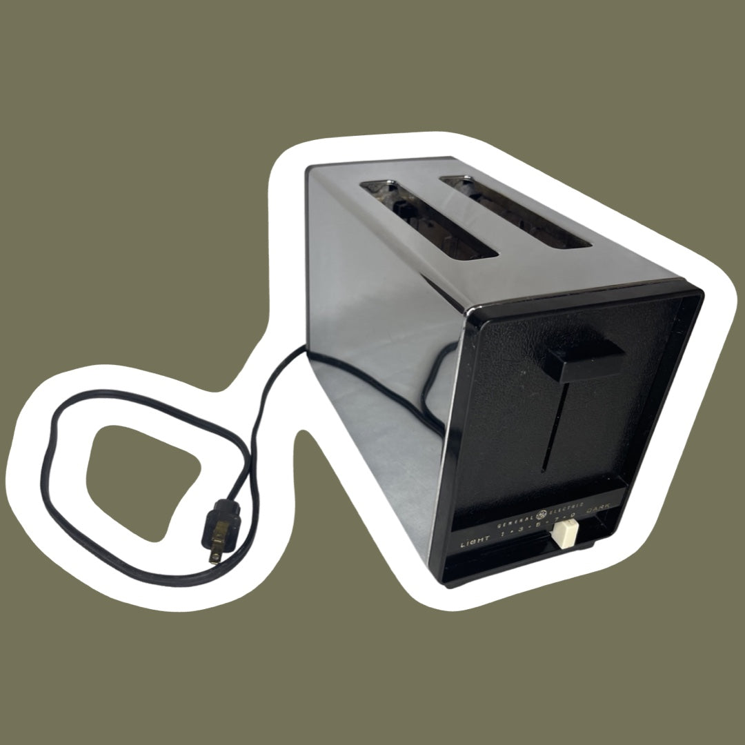 Esta pequeña tostadora de dos rebanadas cromada y negra de GE está en condiciones de funcionamiento y lista para usarse. Tiene signos mínimos de desgaste y el exterior cromado está en casi perfectas condiciones.