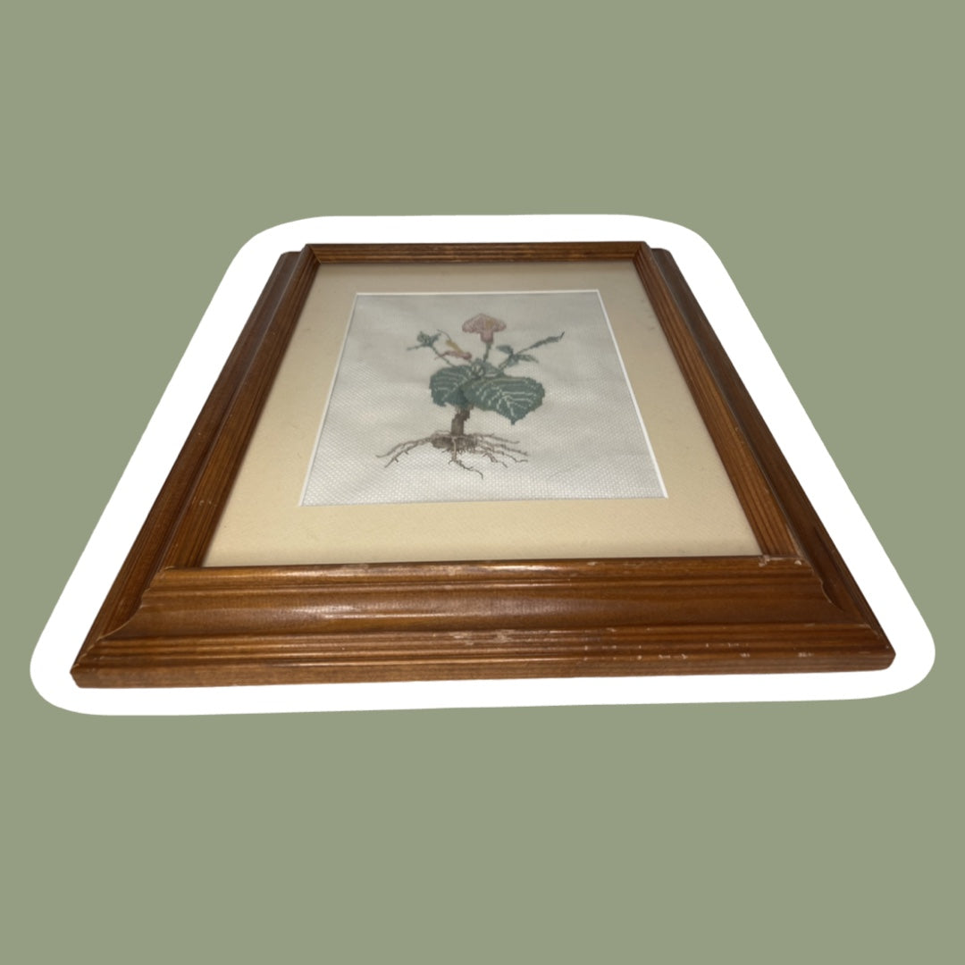 Esta es una obra de arte floral enmarcada y bordada en punto de cruz que se encuentra en excelentes condiciones y tiene un vidrio mate antirreflejos. ¡Perfecta para usarla sola o como parte de un collage de pared!
