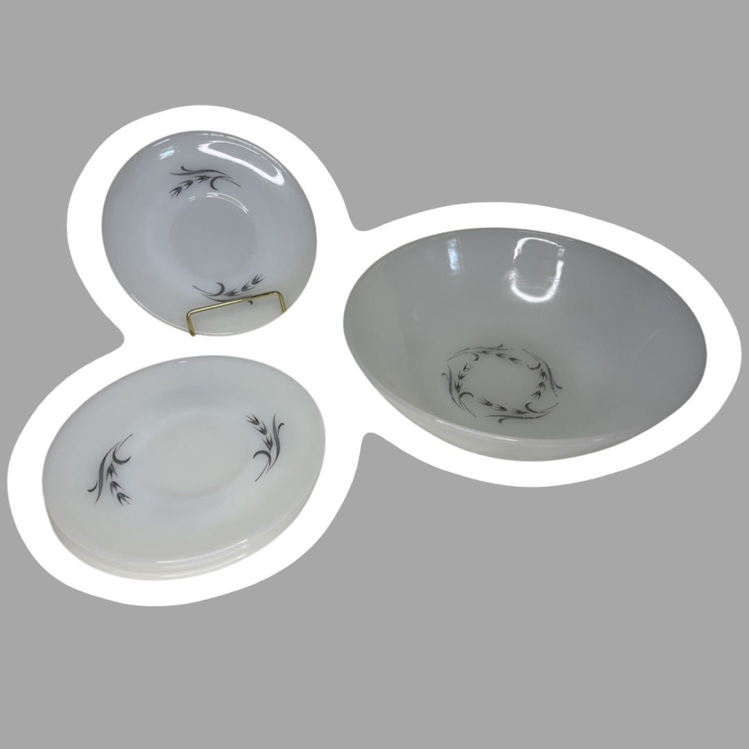 Juego de 5 cuencos para servir y platillos para taza de té con estampado de trigo gris Suburbia 'Fire King' de Milk Glass