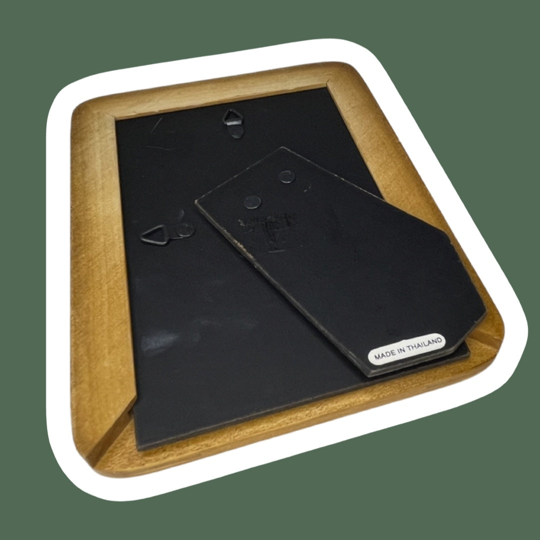 Este es un marco de fotos pequeño de madera, perfecto para exhibir en la pared o sobre una superficie sólida.