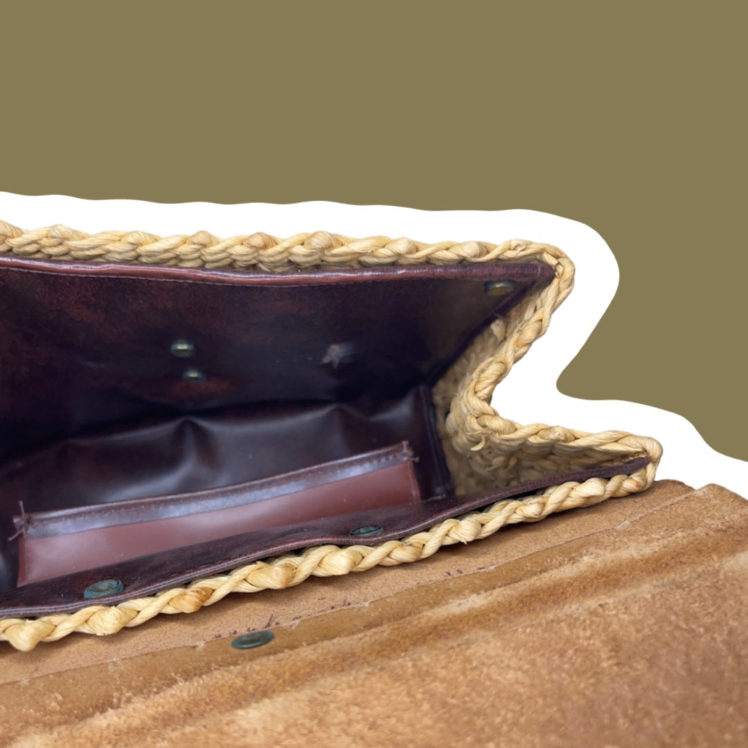 Bolso bandolera estilo bohemio de paja tejida y cuero genuino, década de 1960/70