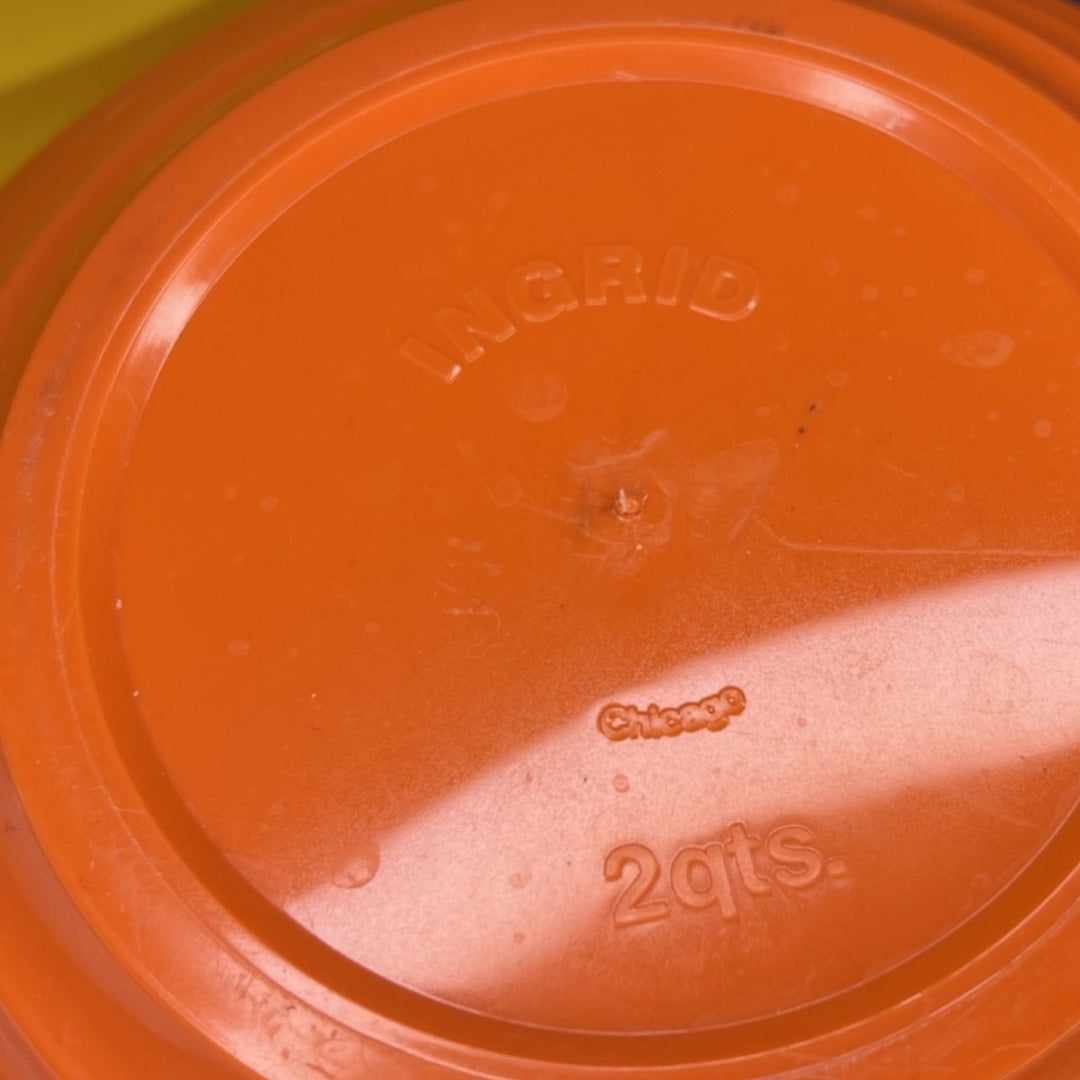 Este es un juego de seis tazones para mezclar apilables fabricados por 'INGRID Chicago'. Los tazones están hechos de plástico y tienen colores brillantes y llamativos. ¡Perfectos para cualquier cocina!