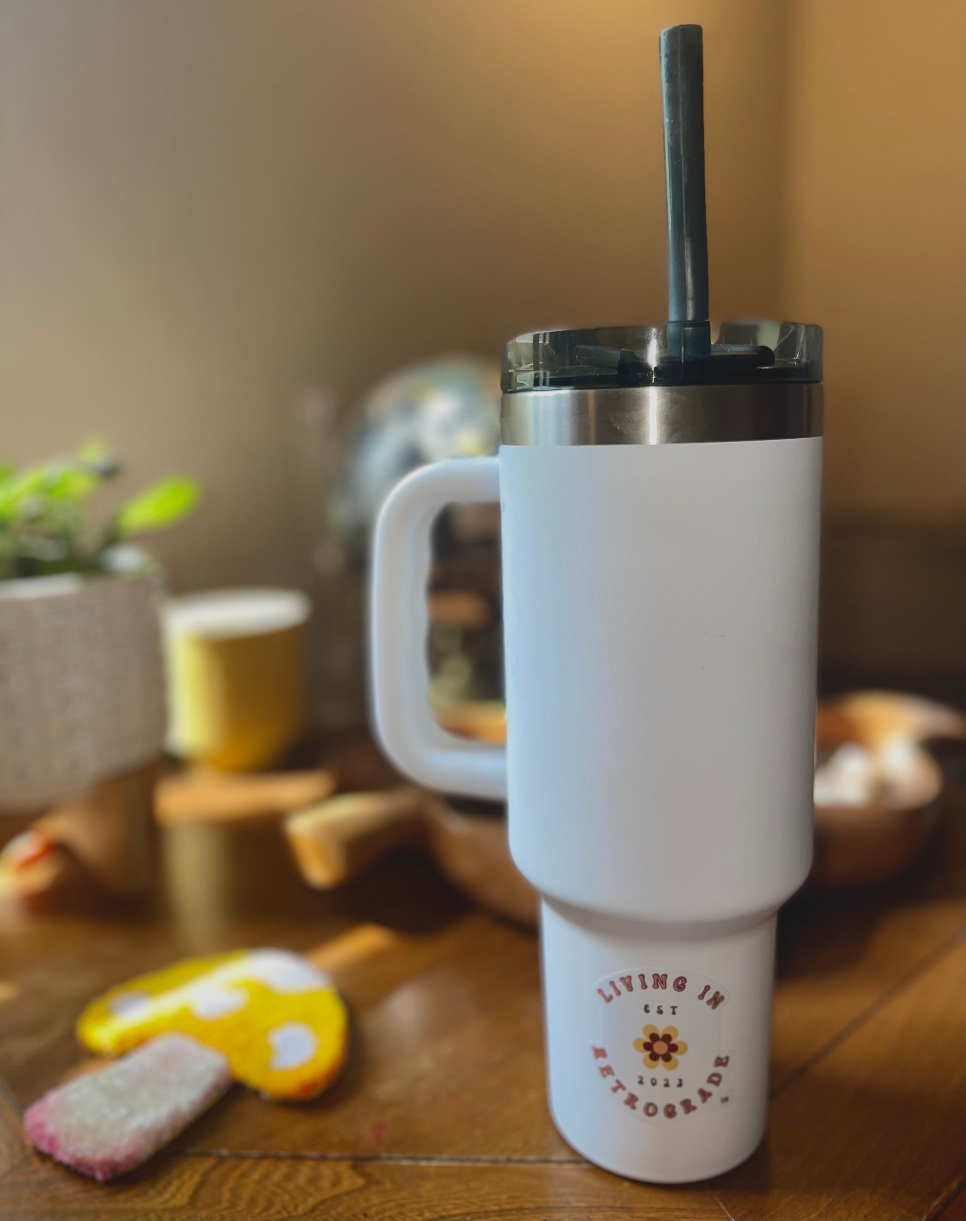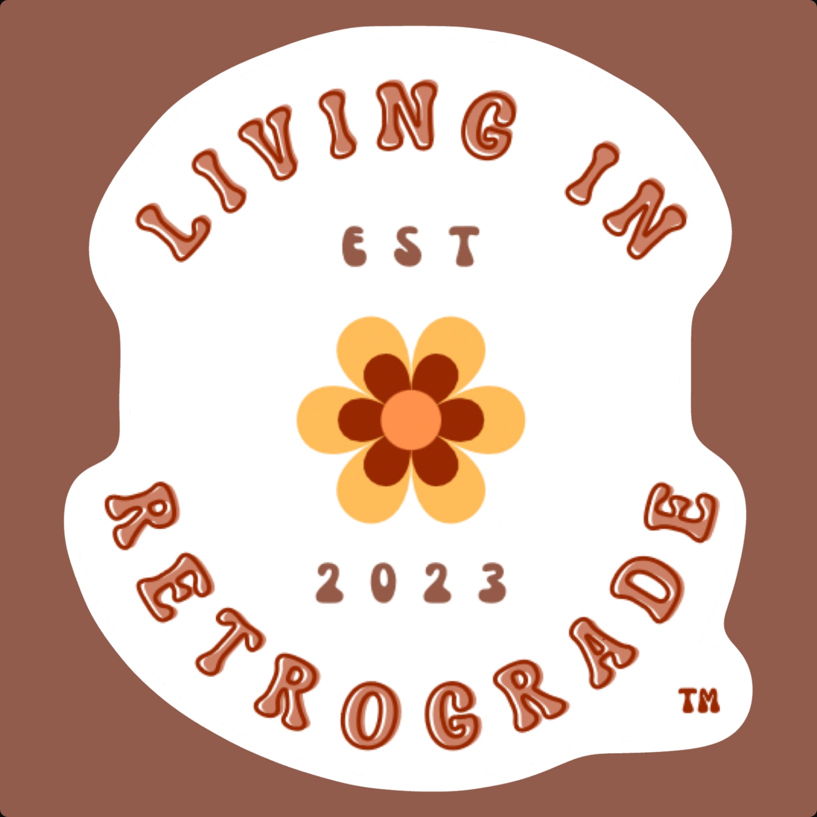 Bonita y pequeña calcomanía de vinilo de 2" "LIVING IN RETROGRADE" para usar en casi cualquier superficie, incluidos automóviles, cuadernos y botellas de agua.