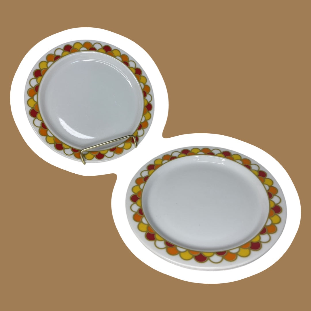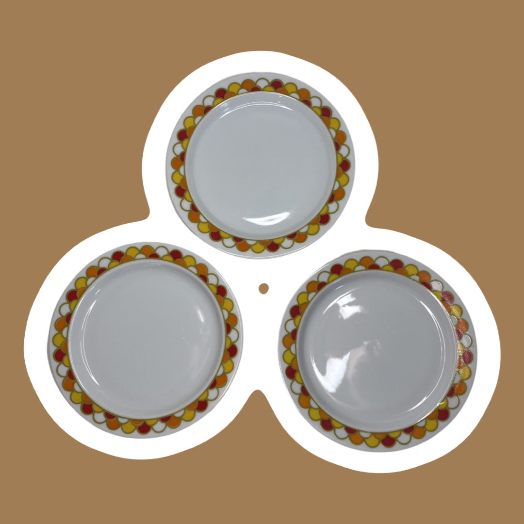 Platos para aperitivos con diseño de carrusel de mediados de siglo, festoneados en naranja, amarillo y rojo, 'Georges Briard', juego de 3