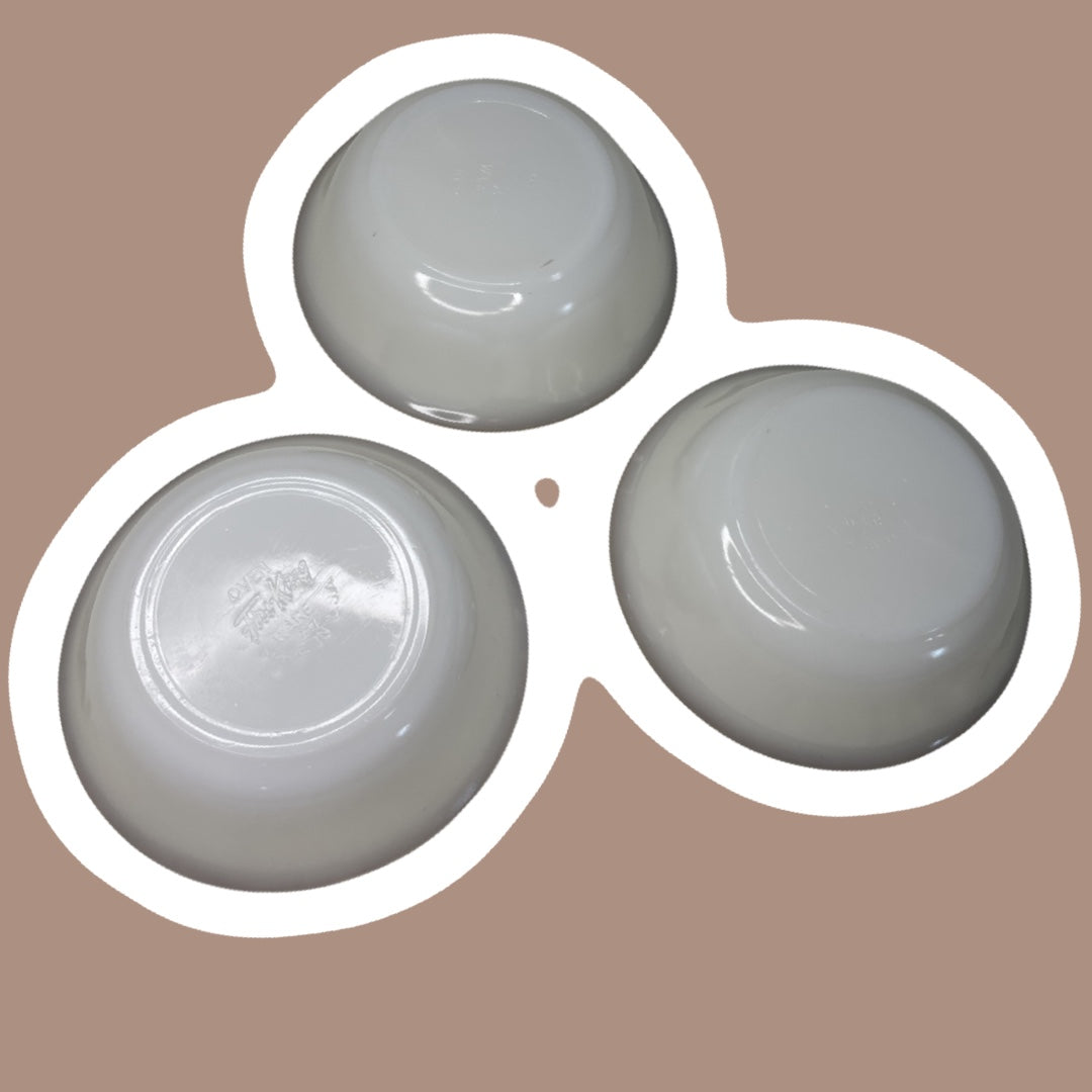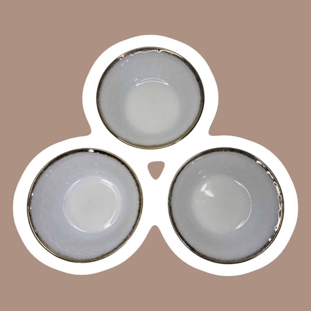¡Súper lindo juego de tres vasos de leche Fire King y cuencos de bayas con borde dorado!