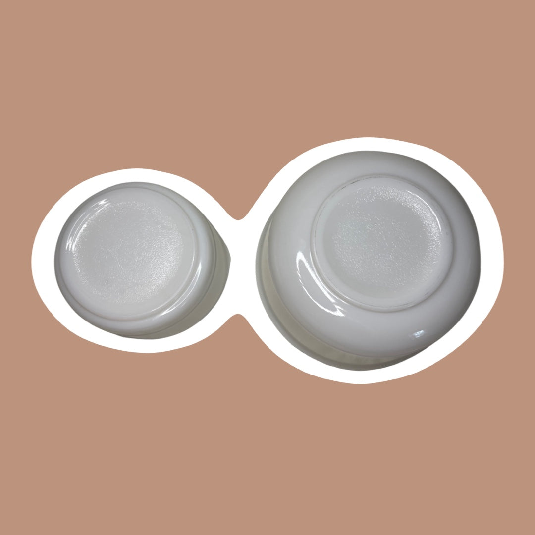 Este es un hermoso juego de dos tazones para mezclar de vidrio con leche, de alta resistencia, que originalmente se fabricaron como parte de un juego con una batidora de pie.