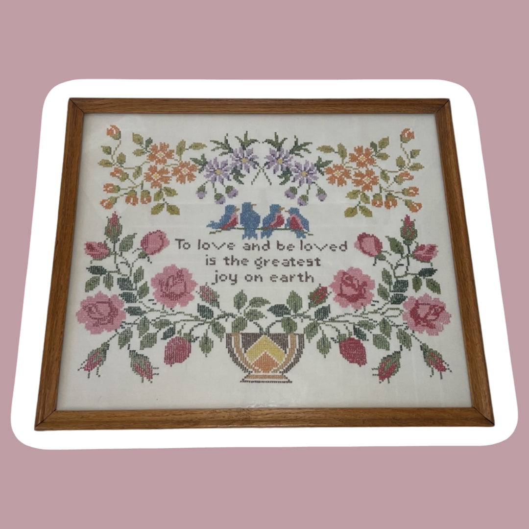 Adorable obra de arte enmarcada con bordado en cruz, con motivos florales y colores pastel, que presenta la frase “amar y ser amado es la mayor alegría de la tierra”. ¡Puede ser un gran complemento para un collage de pared o como pieza de diseño independiente!