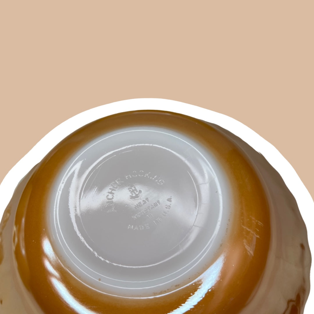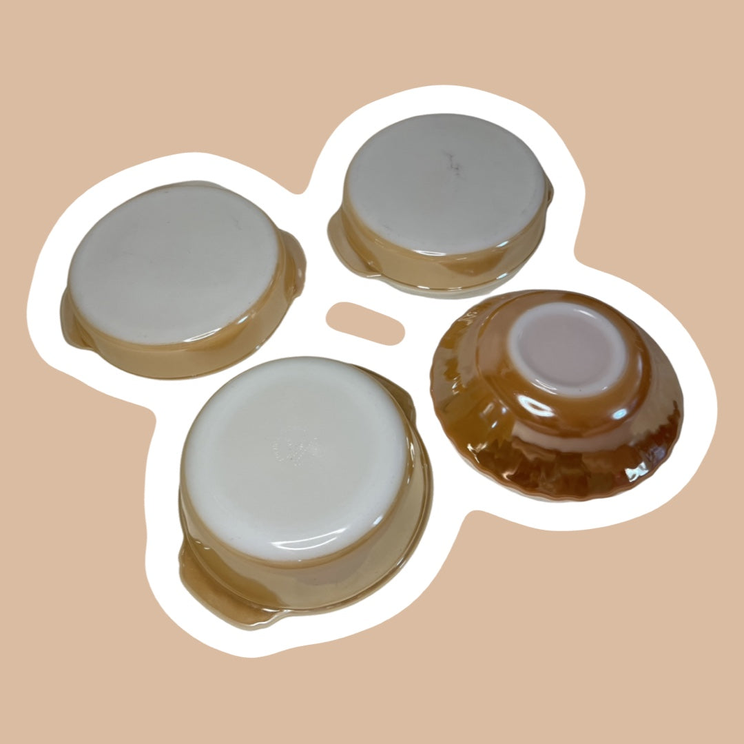Este juego de cuatro impresionantes platos de vidrio con leche Fire King, de color lustre melocotón, está en excelentes condiciones, sin signos visibles de desgaste o daños en lavavajillas.