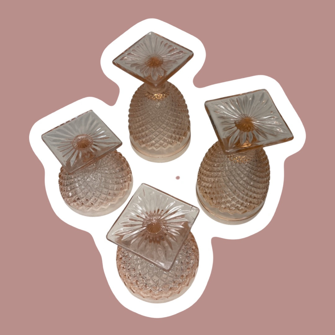 Este es un hermoso juego de cuatro vasos de vidrio adornados con tachuelas de color rosa ruborizado o durazno de la década de 1930 de Hocking Glass Co. Este juego consta de dos vasos para sorbete o champán y dos vasos o copas para agua. ¡Serán una hermosa pieza llamativa en cualquier exhibición!