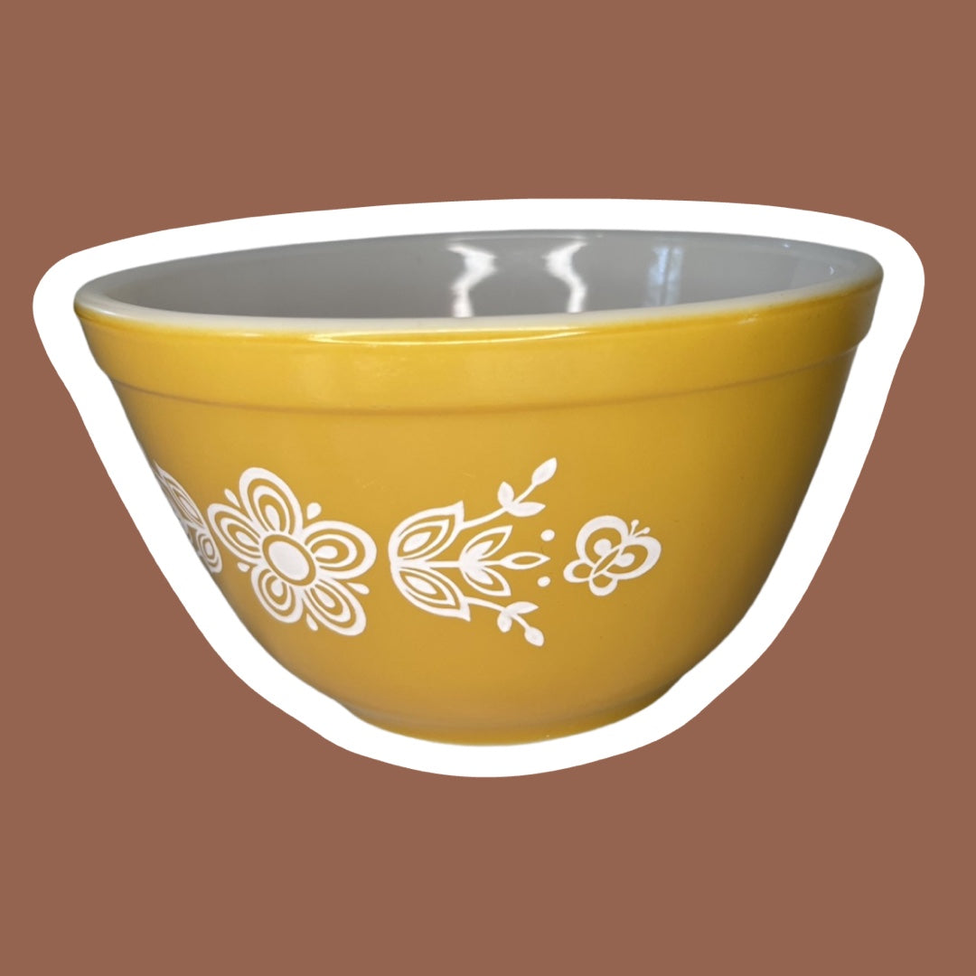 Este es un hermoso tazón para mezclar de Pyrex de color amarillo mostaza con diseño "Butterfly Gold". Está en excelentes condiciones y apenas tiene señales de uso. ¡Un diseño clásico y excelente para cualquier cocina!