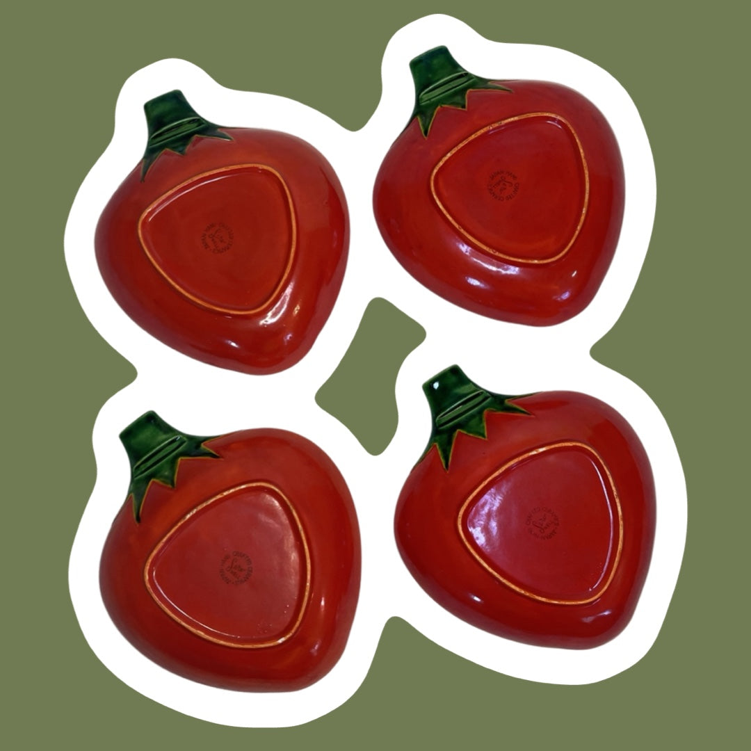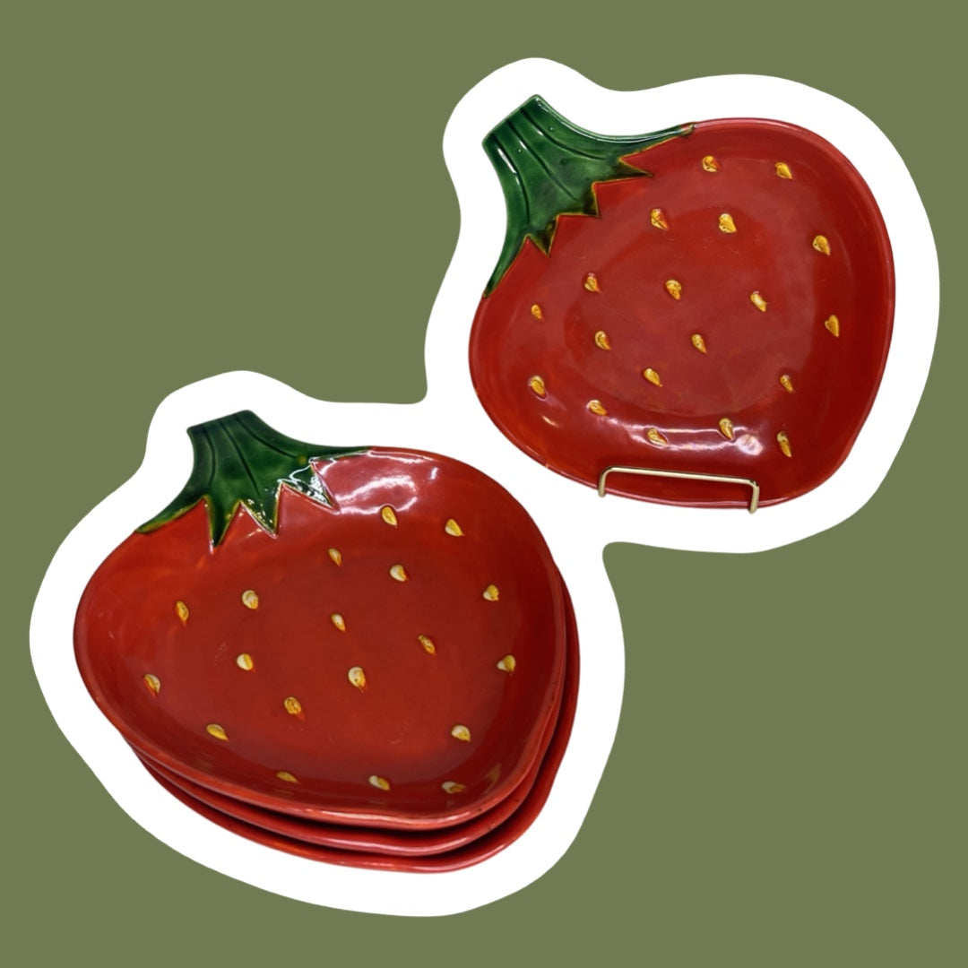Este es un juego de cuatro platos de aperitivo de cerámica con forma de fresa. ¡Un juego adorable y veraniego!