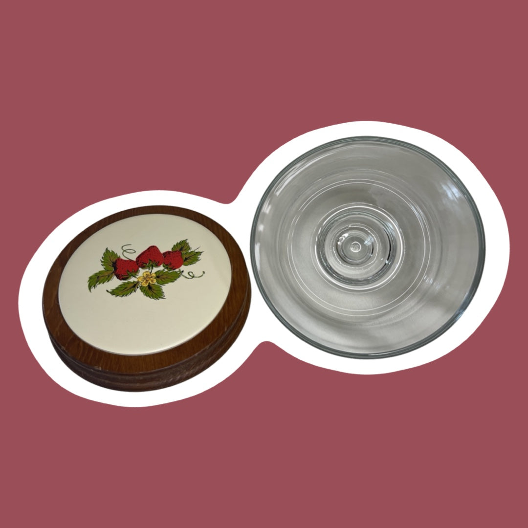 ¡Este es un adorable plato para queso con diseño de fresas y campana de vidrio! Es probable que sea de la década de 1970/80 y quedaría muy lindo en una cocina ecléctica o vintage.