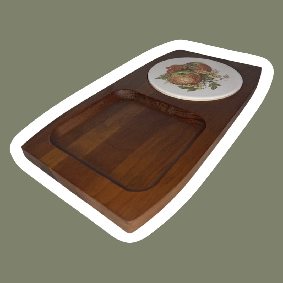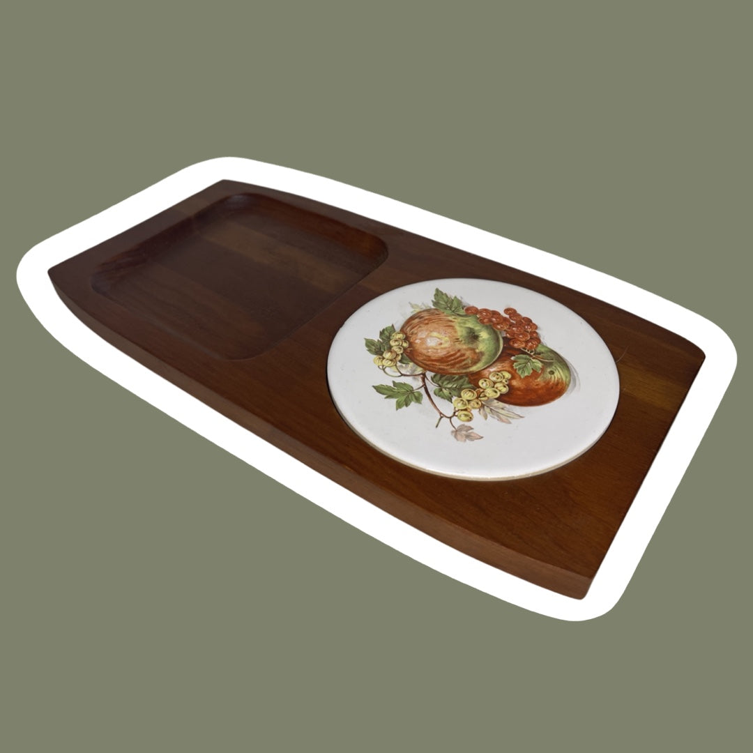Bandeja para servir quesos de madera con incrustaciones de cerámica con diseño de manzana