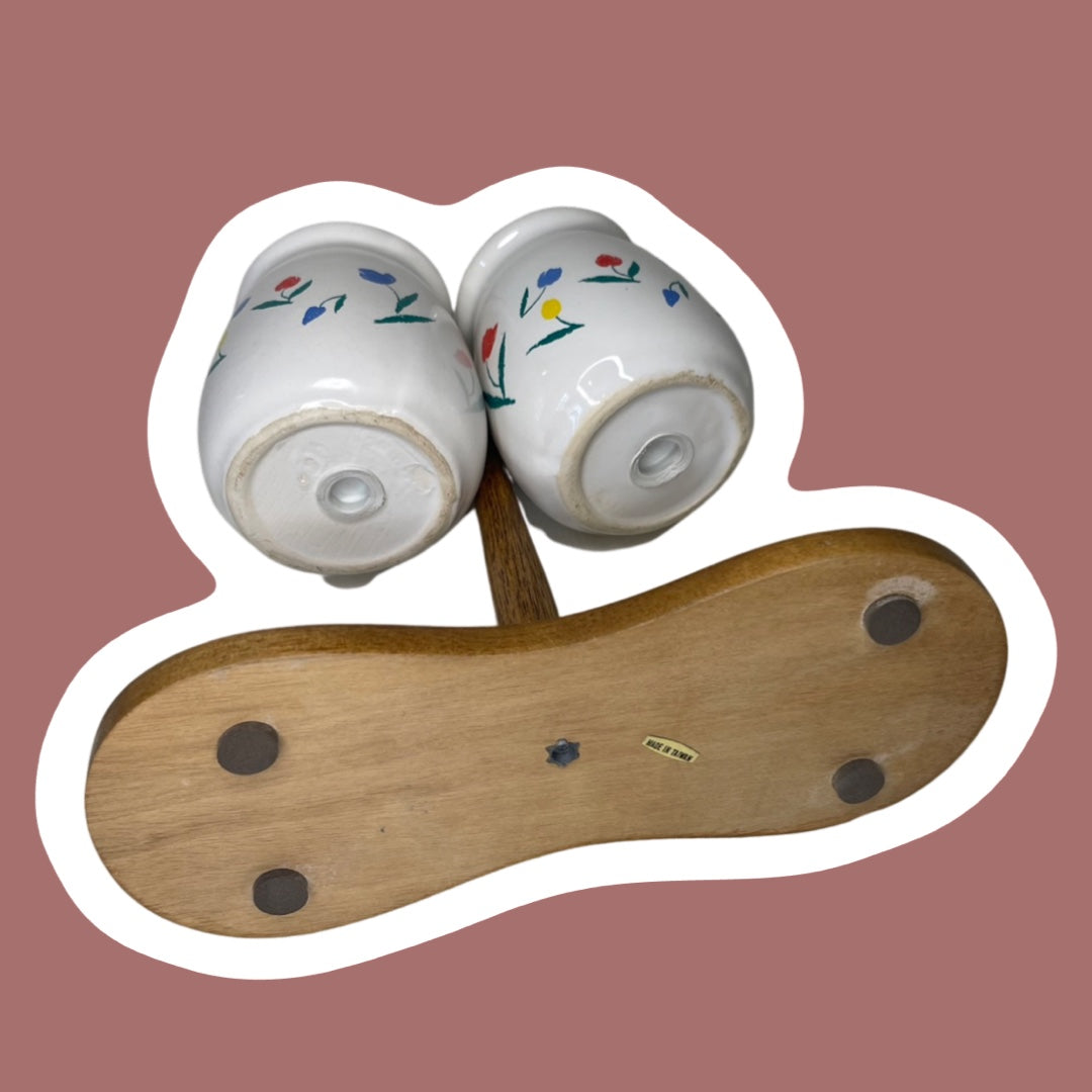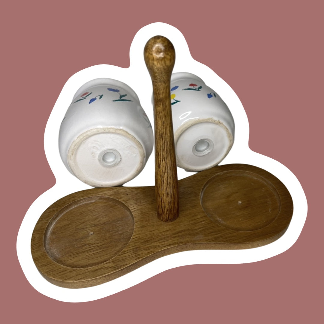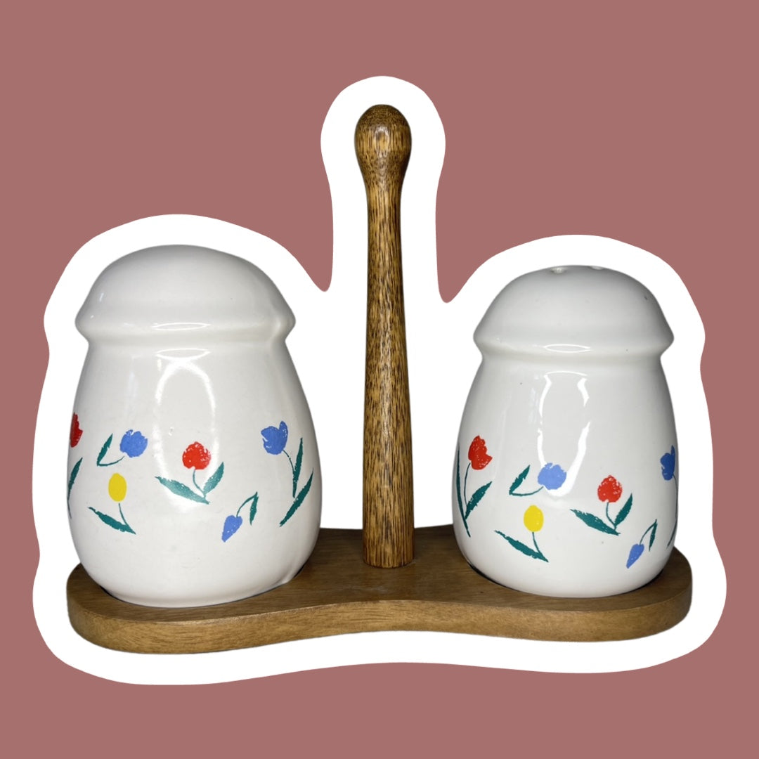 Adorable set of salt and pepper shakers in the pattern 'Tulip Time'. They come with a little wooden holder/stand and are in near perfect condition!