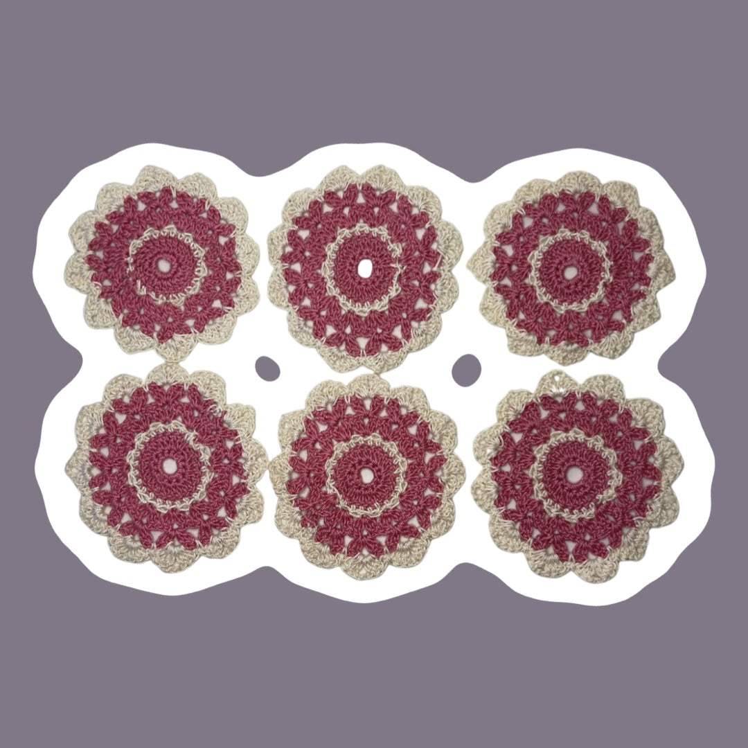 This is a set of SIX adorable pink and white crocheted drink coasters/doilies.