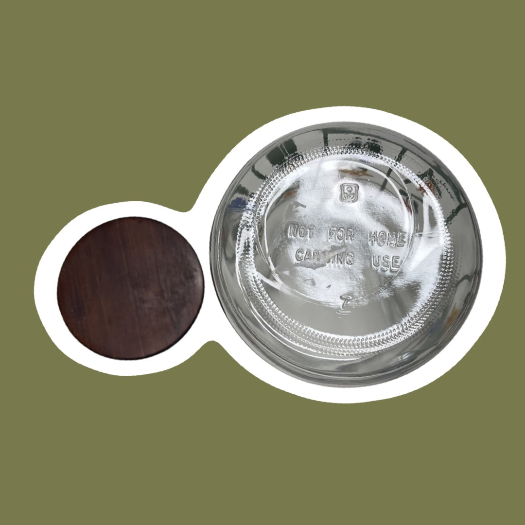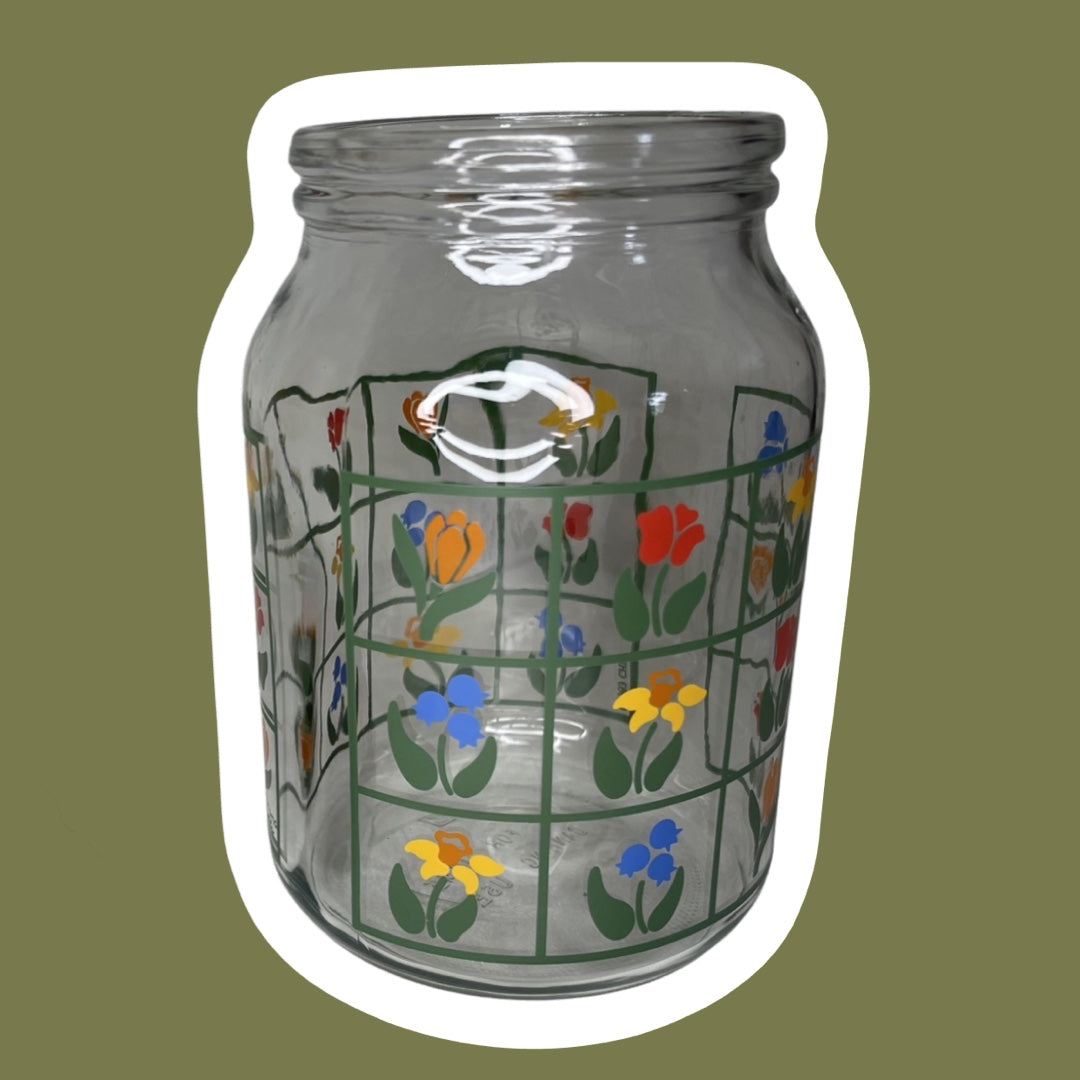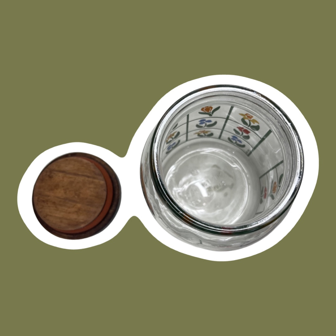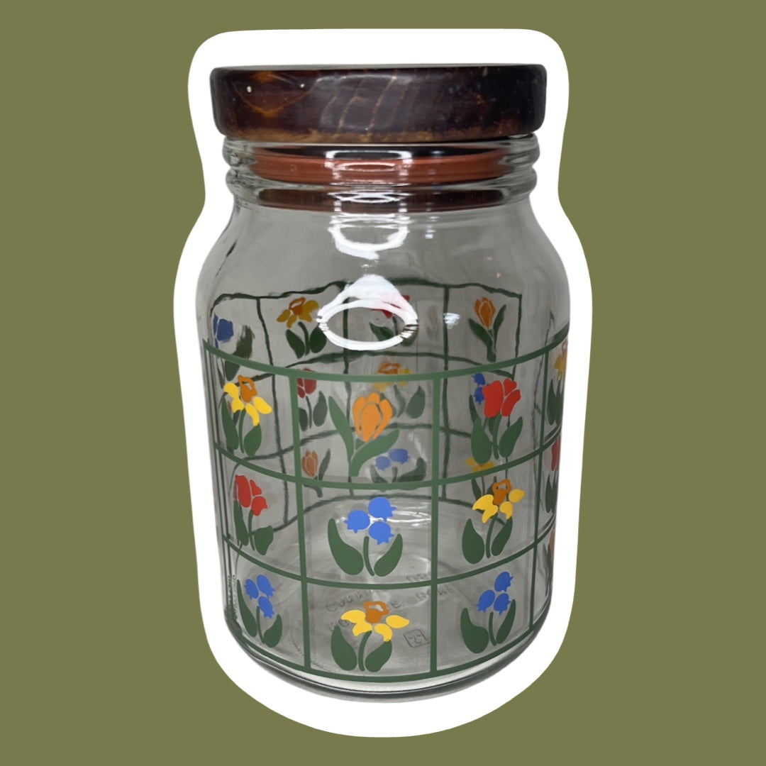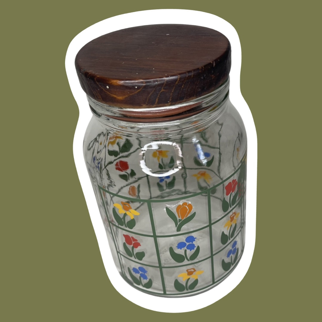 This floral, colorful glass canister with wooden lid is quintessentially 80s!