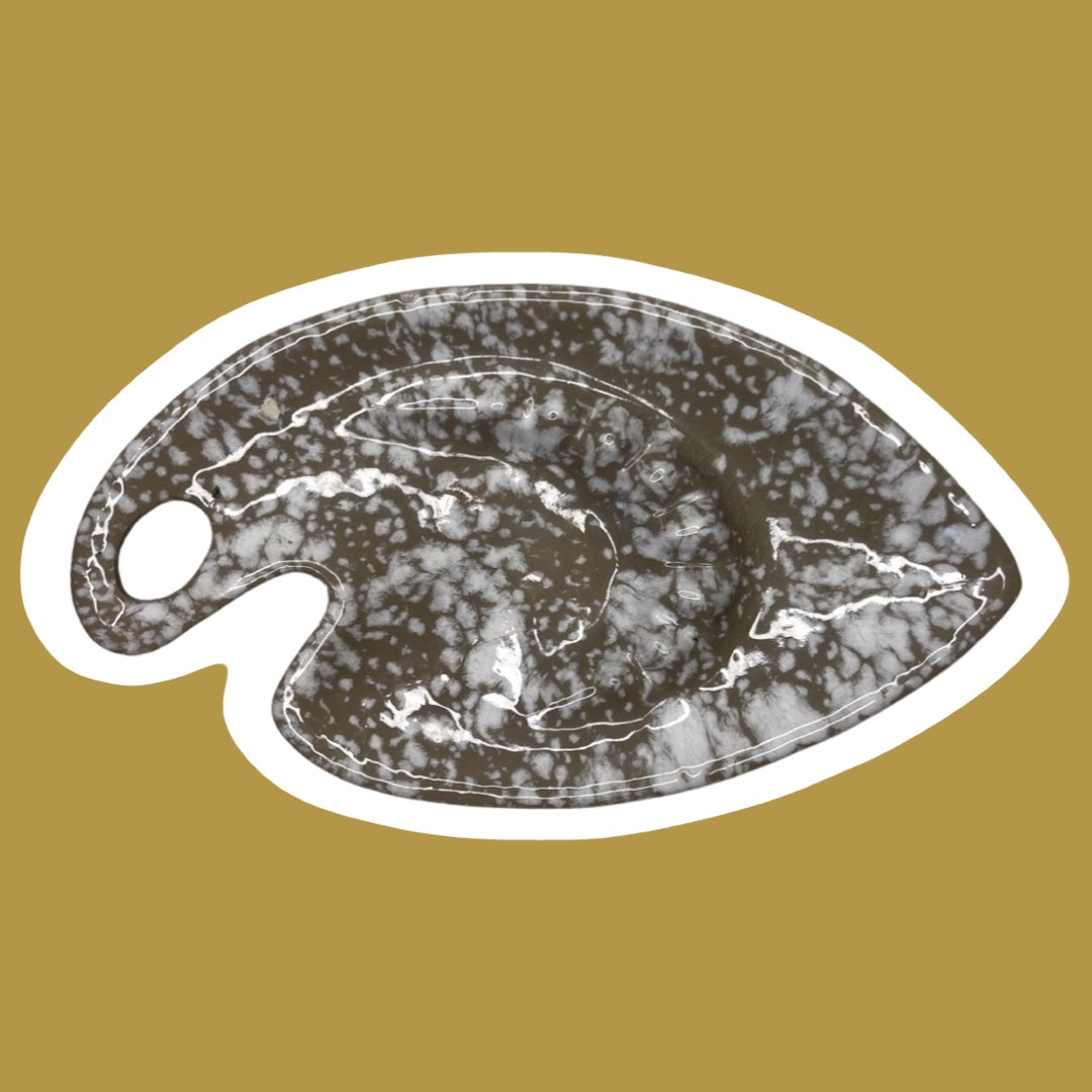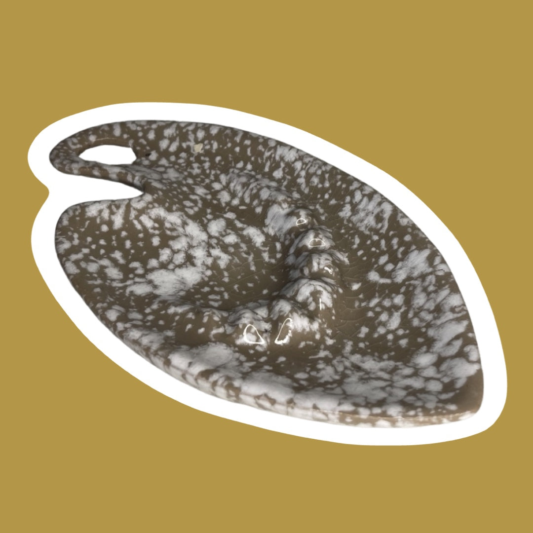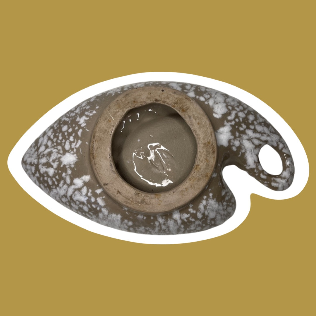 This unique, eclectic style, mid-century modern ash tray is likely from the 1960's and is in the color tan/taupe with white speckles. It appears to be handmade, with an 'S' shaped marking on the bottom.