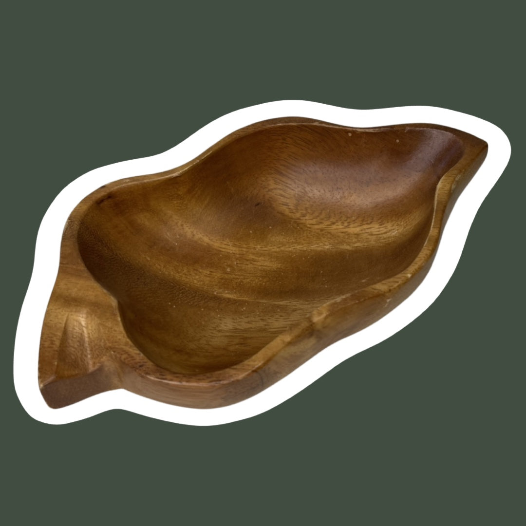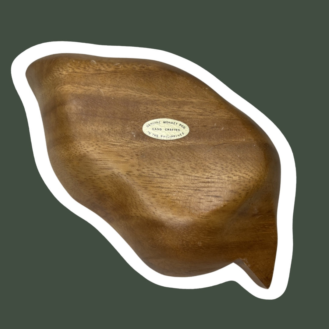 This is a leaf shaped monkey pod wood trinket tray.