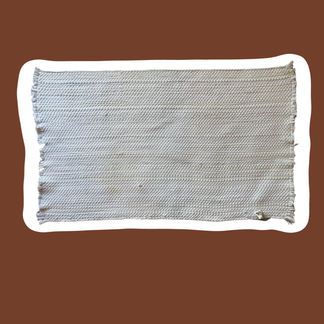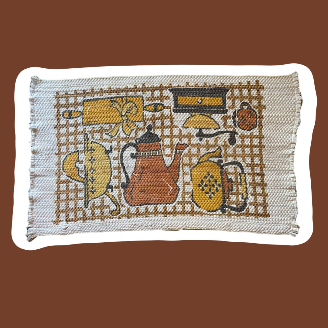 This is a quintessentially mid-century modern throw/area rug that would be absolutely perfect in a vintage or eclectic kitchen. It's made by the company, "Prin-Craft" and features mid-century style kitchen utensil motifs. With beautiful burnt oranges, mustard yellow and browns, this is the perfect rug for any vintage lover!