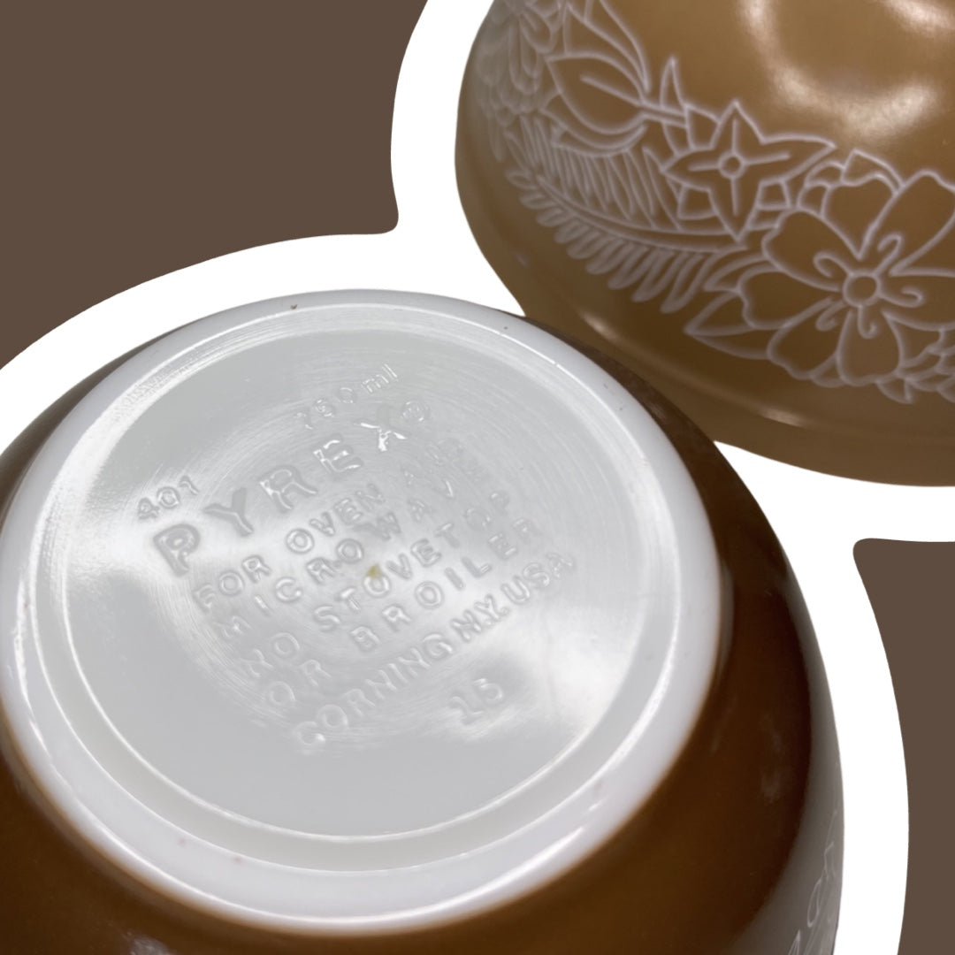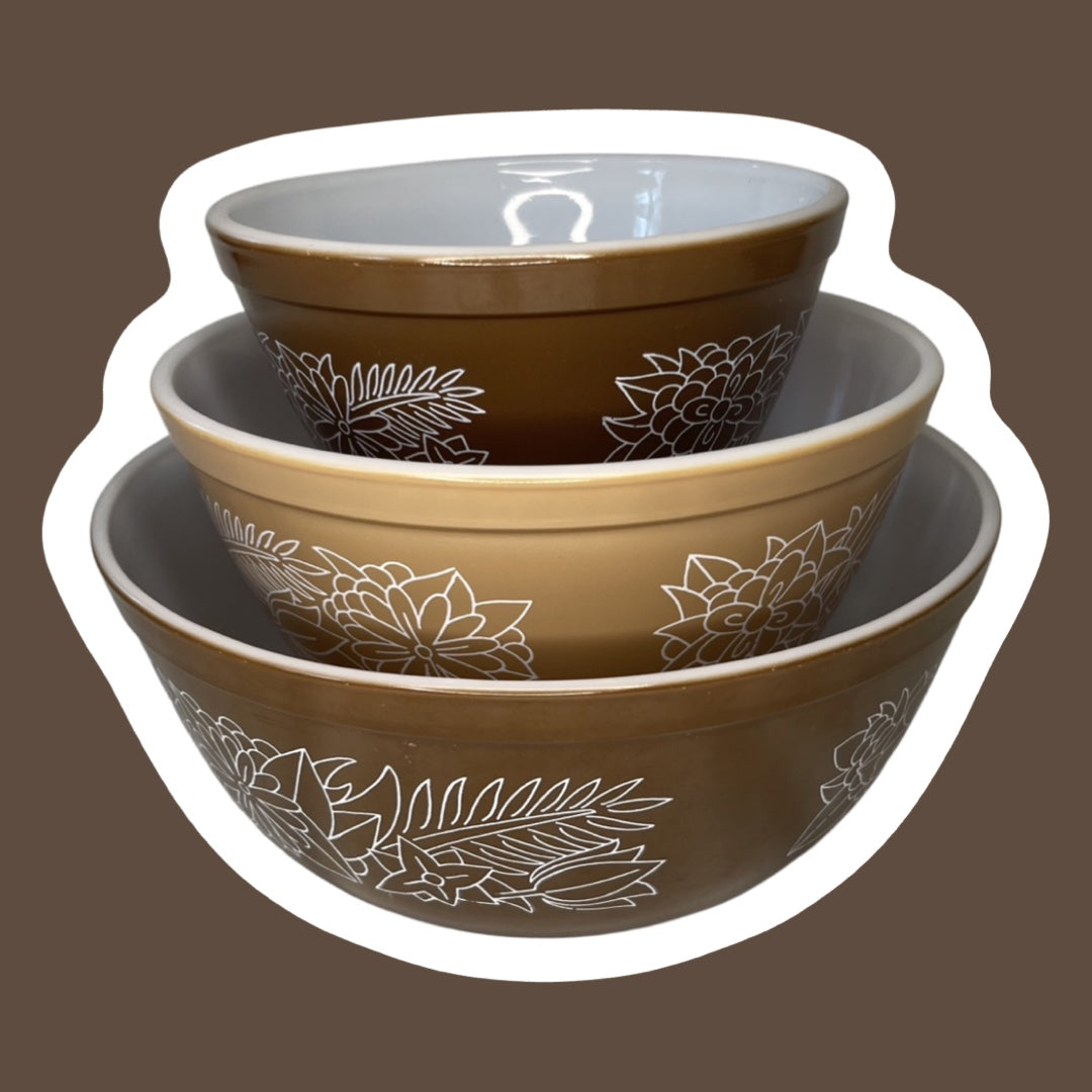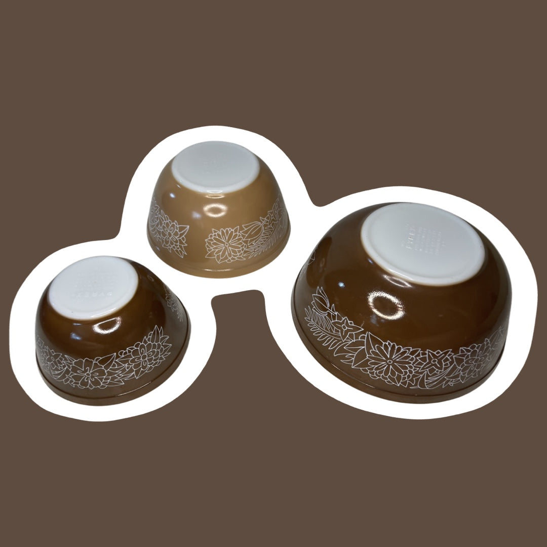 Set of Three Pyrex 'Woodland' Pattern Milk Glass Mixing Nesting Bowls, #401, 402 & 403